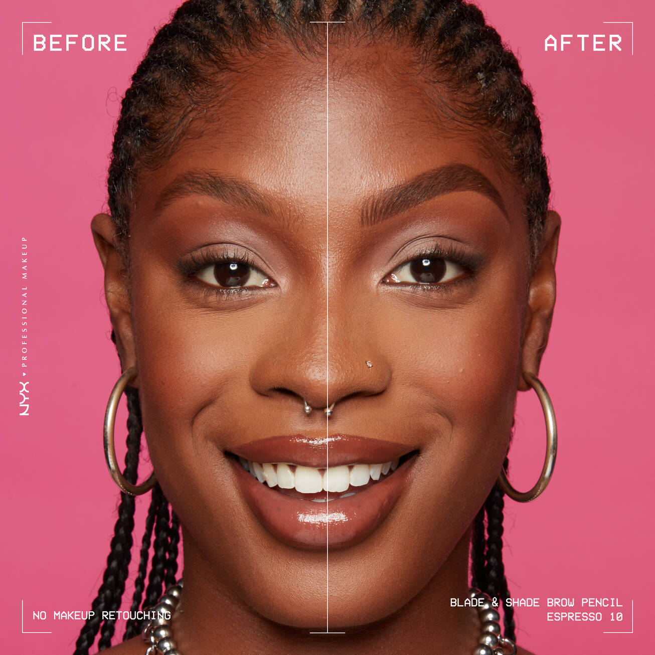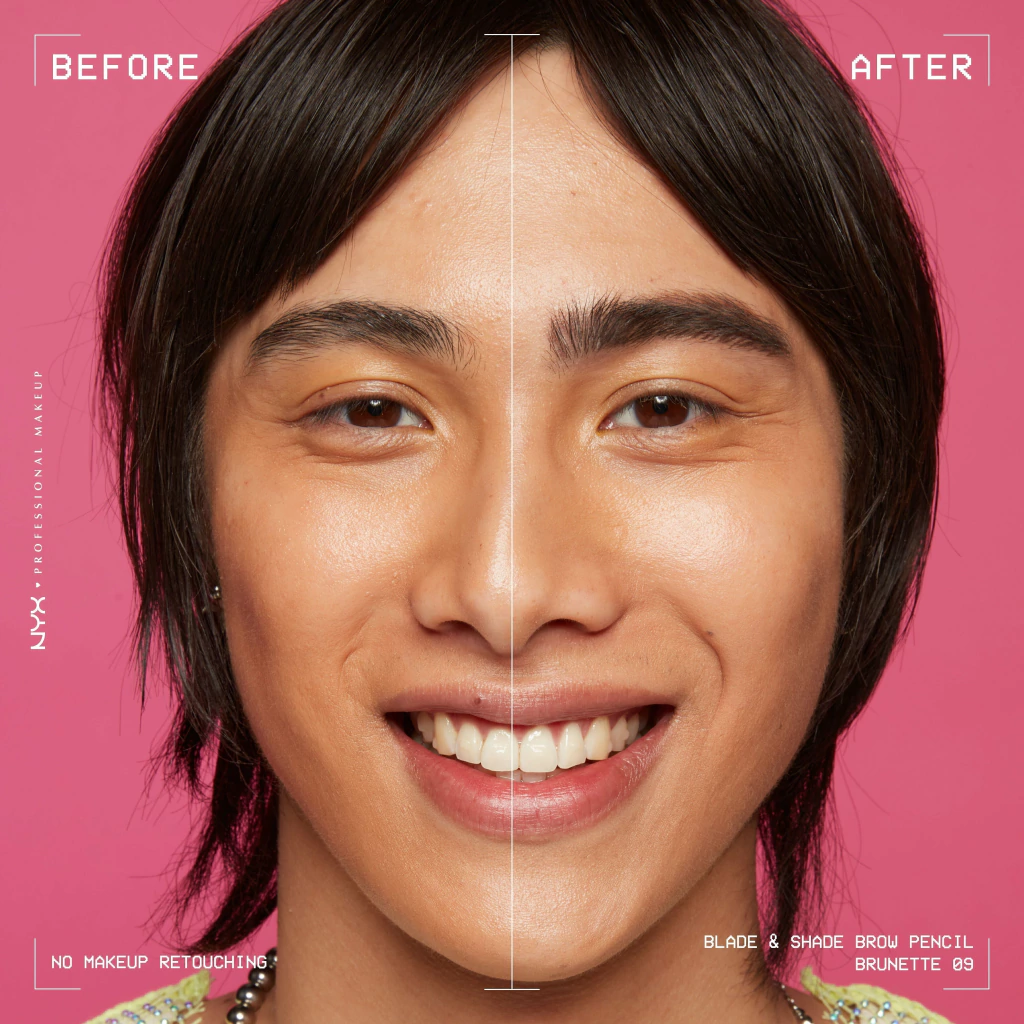 Resistente a manchas e transferências. A ponta de dois gumes do Blade & Shade cria traços finos como lâminas, semelhantes a pelos + um preenchimento sombreado natural que permanece nítido para sobrancelhas nano o dia todo.