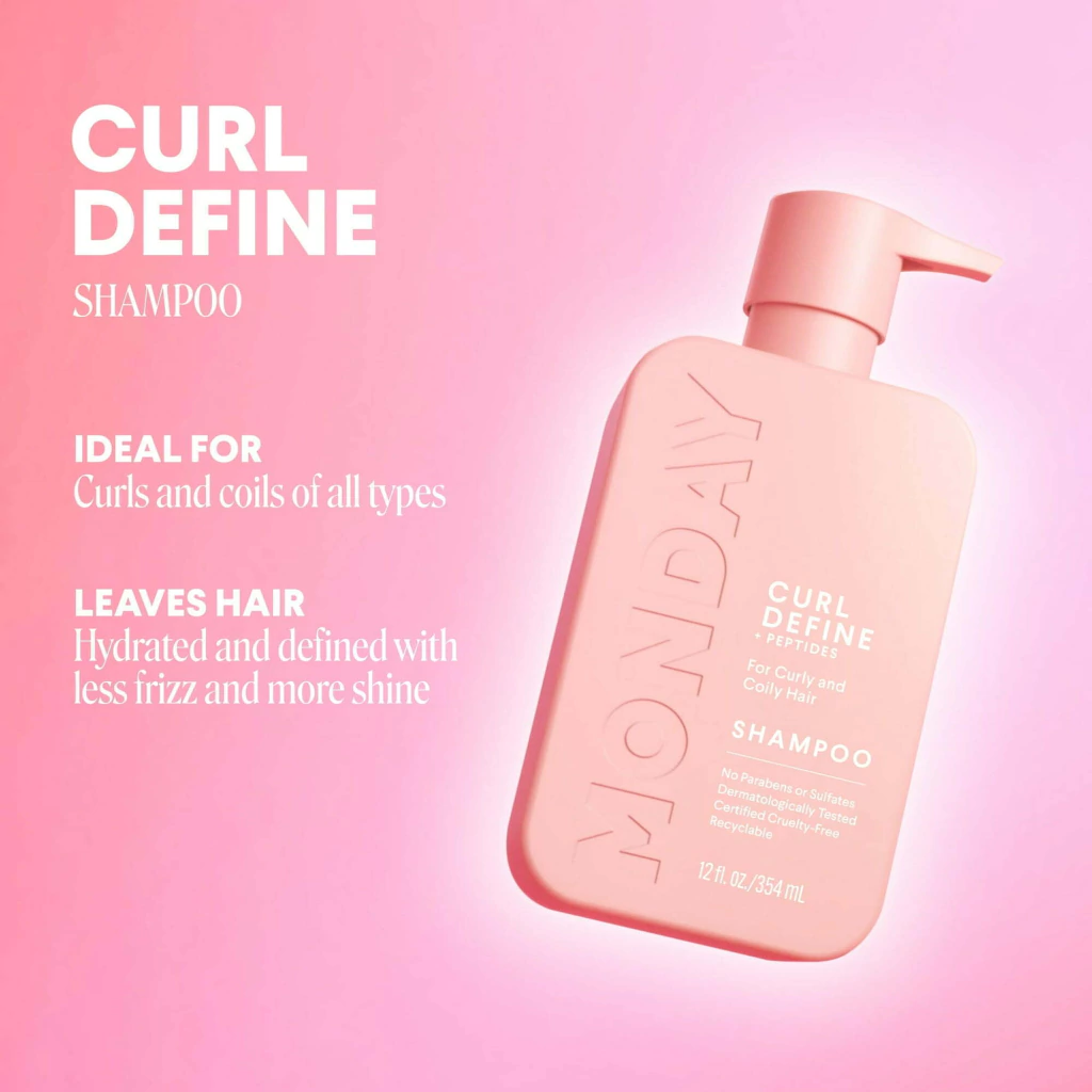 SHAMPOO CURL DEFINE: O shampoo CURL DEFINE da MONDAY Haircare é uma fórmula de suporte que contém peptídeos hidratantes e ingredientes naturais suaves, como óleo de coco, para controlar o frizz e realçar o brilho, ao mesmo tempo que nutre e fortalece o cabelo.