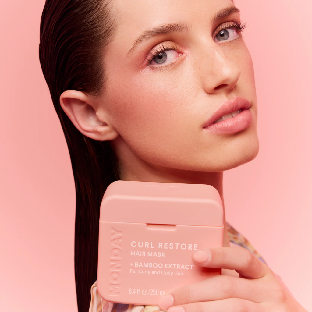 A Máscara Capilar MONDAY Haircare CURL RESTORE restaura a hidratação e o brilho dos cachos de todos os tipos, graças ao Extrato de Bambu nutritivo e à Manteiga de Karité. Os cachos ficam macios e renovados, para mais dias de cabelo bonito.
