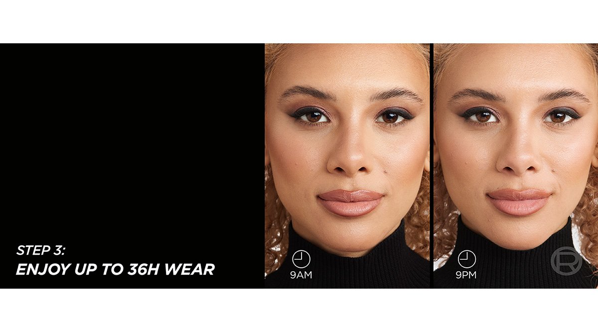 • Uso resistente a transferências de até 36 horas. Resistente ao suor e manchas. A maquiagem para rosto, olhos e lábios resiste à transferência o dia todo