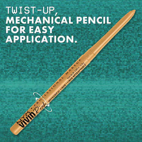 Lápis de olho mecânico pigmentado em tons de pedras preciosas em 12 tons vívidos foscos, brilhantes e metálicos.