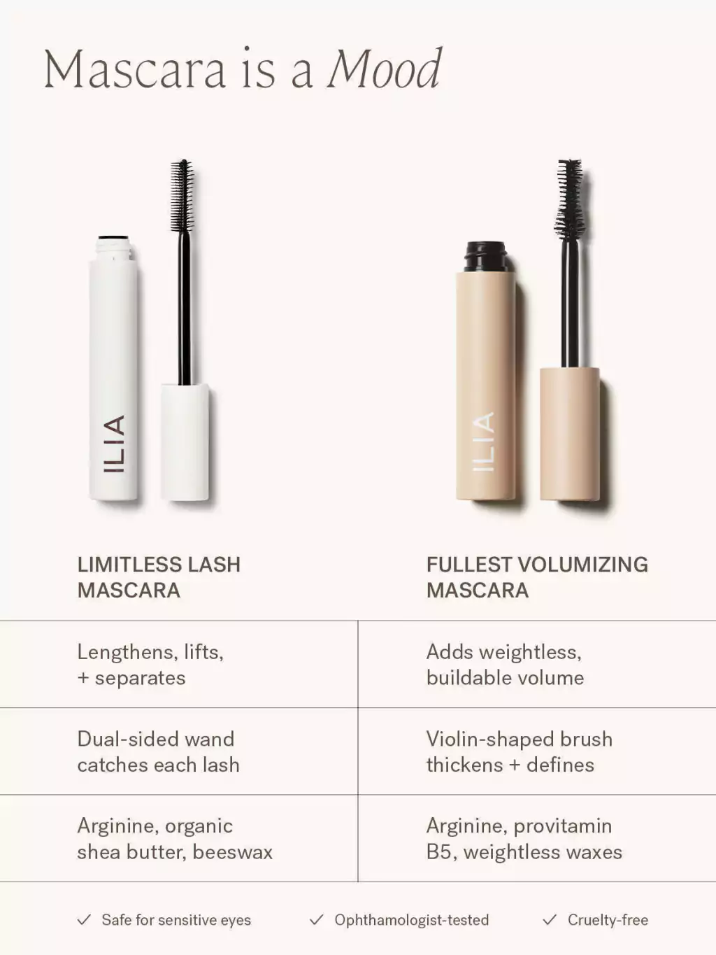 Limpo, confortável e leve, o ILIA Limitless Lash Mascara resiste a manchas e descamação ao longo do dia.