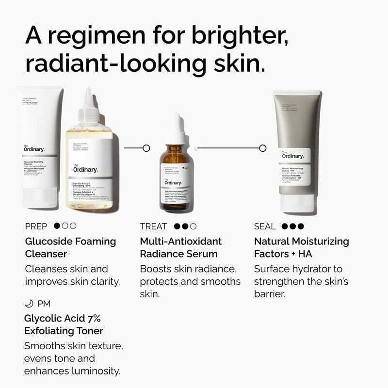 O Multi-Antioxidant Radiance Serum combina um total de 8 tecnologias, incluindo vitamina C e ginseng, e alcança uma abordagem multifacetada para proteção antioxidante adequada para uso tanto de dia quanto de noite. Quando usado durante o dia, a formulação texturizada de sérum ajuda a proteger contra os efeitos nocivos da poluição, ao mesmo tempo em que fornece fortalecimento da barreira e hidratação duradoura para maior resiliência da pele.