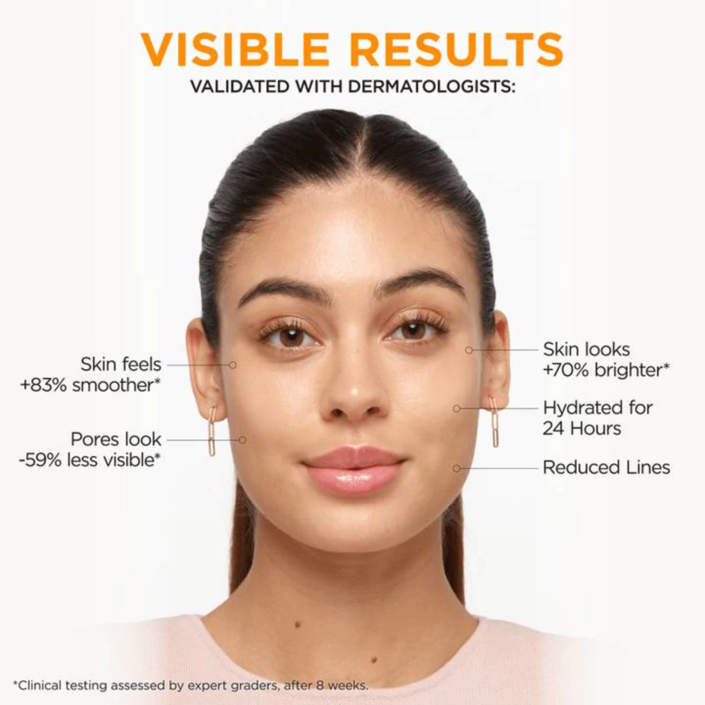 Regula a pigmentação, protege a estrutura da rede de colágeno e suporta a síntese de lipídios epidérmicos para restaurar a barreira da pele. A vitamina C é, portanto, um aliado para a pele cansada, pois ilumina e suaviza a pele opaca.