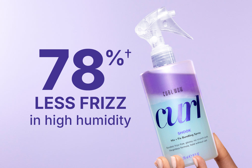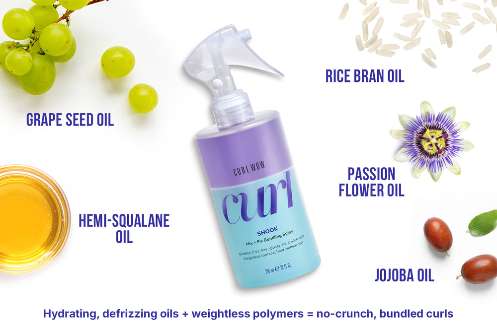 A fórmula bifásica exclusiva “agite para ativar” do spray de cachos Shook apresenta uma parte de óleos hidratantes naturais poderosos + uma parte de polímeros inovadores que agrupam cachos para resultados de “cachos nus” definidos e saltitantes