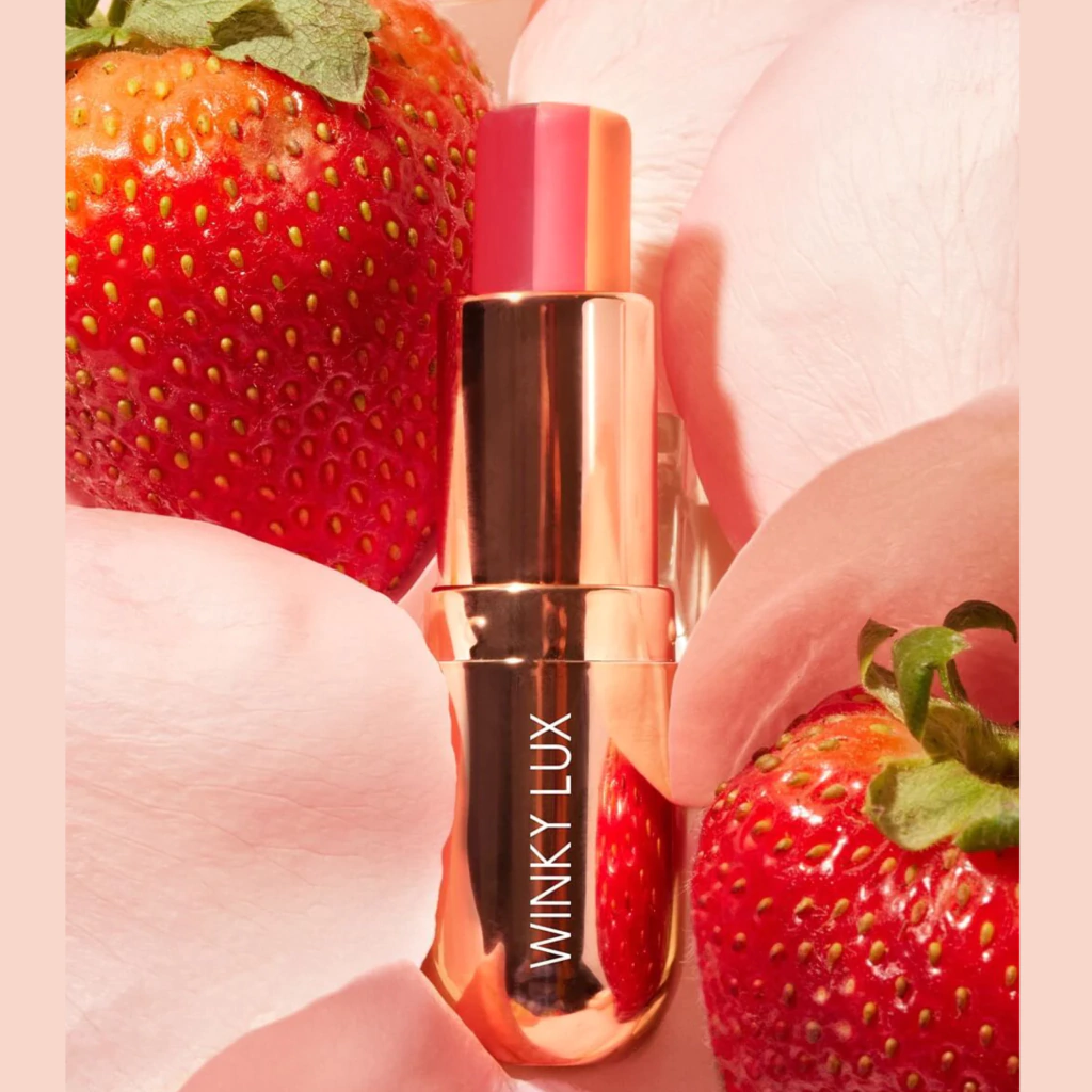 Um protetor labial rosa inspirado no morango com ingredientes hidratantes e nutritivos.